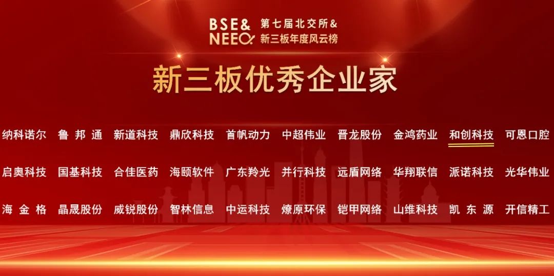 經由北交所及新三板投資者保護指數綜合評選,和創科技榮獲第七屆北交所&新三板年度風云榜盛典“新三板最具投資價值企業”,和創科技創始人/總經理劉學臣被評為“新三板優秀企業家”。