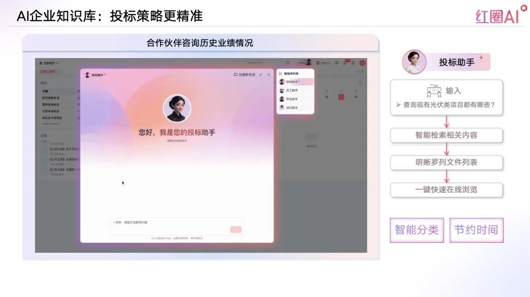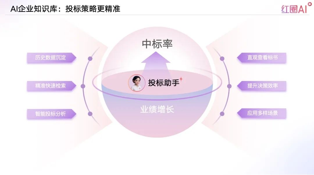 以往投標流程中,資料查找和內容比對耗時耗力、風險頻發。紅圈AI通過快速檢索歷史標書、技術方案、成功案例等內容,助力企業建立專屬“投標智庫”,讓策略制定更具數據支撐。