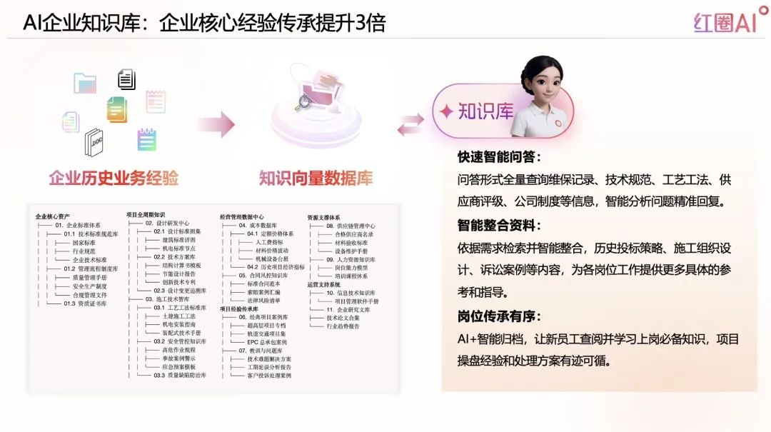 企業在經驗傳承上往往面臨資料分散、查找困難、更新滯后等難題。紅圈AI通過構建知識向量數據庫,將分散在文檔、郵件、制度、系統中的“碎片知識”智能歸集,并支持自然語言提問,3秒獲取精準答案,真正實現“人人皆可答,事事有依據”。