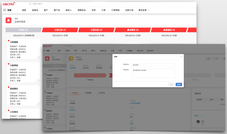 新版本在銷售機會階段推進的過程中加?了“理單”環節,提供了一個銷售管理者與?線銷售?員?對?評價指導的平臺,管理層可以為銷售?員提供針對性的?作指導,提高銷售成功率,并能更加客觀和準確地做出銷售預測。對于理單條件和理單階段等的自定義設置,企業同樣可以在后臺實現。