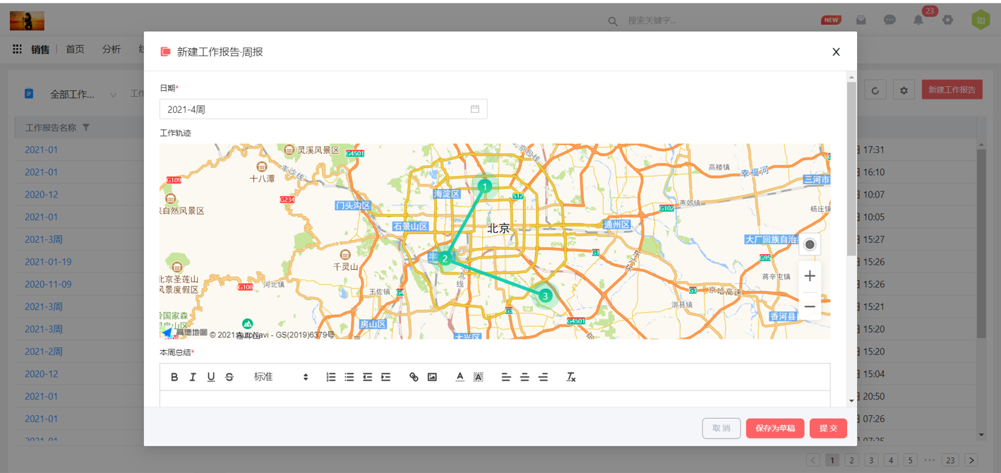 工作報告支持定位,可以生成軌跡報告了,同時工作計劃總結支持結構化形式填寫,相信你的工作報告以后會更專業出彩。
