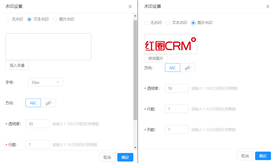 水印設置,支持文字和圖片水印,其中文字水印可以取系統字段作為變量