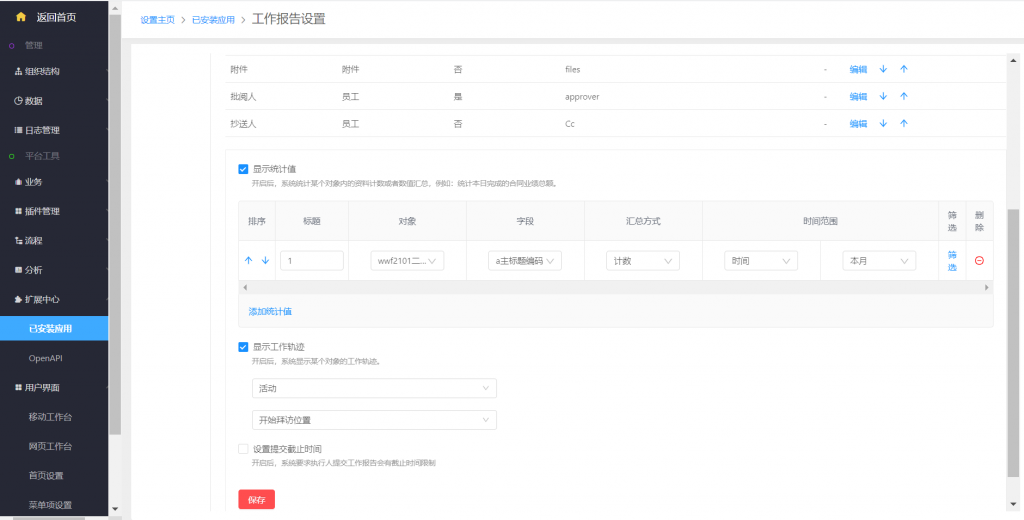 【后臺設置】系統設置—擴展中心—已安裝應用—工作報告—模板設置中,在原有統計值下面增加了顯示工作軌跡,可以配置一個對象的一個地圖定位型字段進行統計,統計時間默認為報告時間段內,如周報默認統計一周內創建這個對象的數據
