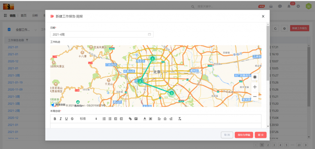 【前臺操作】新建工作報告、查看工作報告,可以根據后臺配置的軌跡對象的定位字段,形成地圖連線,并支持點擊查看詳情