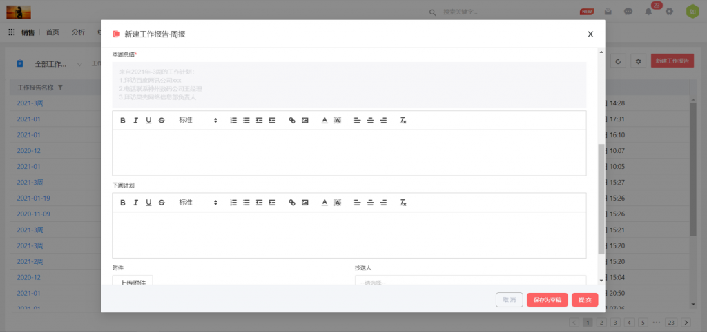 工作報告在總結字段上顯示上次的工作計劃,此功能默認啟用,不需要配置。