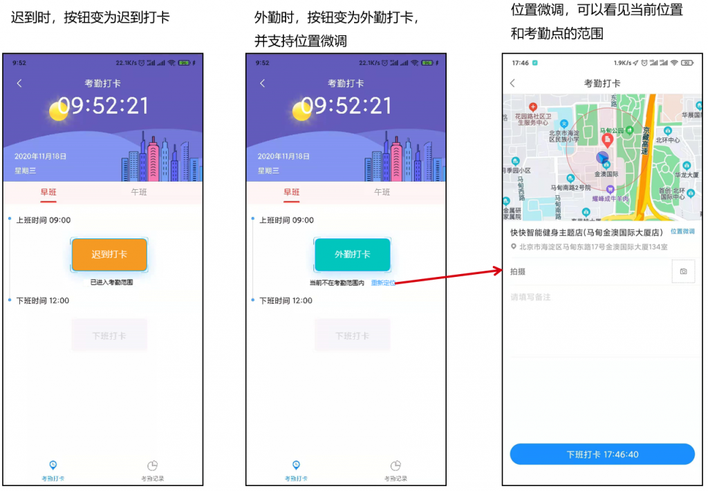 3)APP端考勤打卡頁面調整,支持位置微調,遲到早退等異常打卡需填寫備注和拍照等