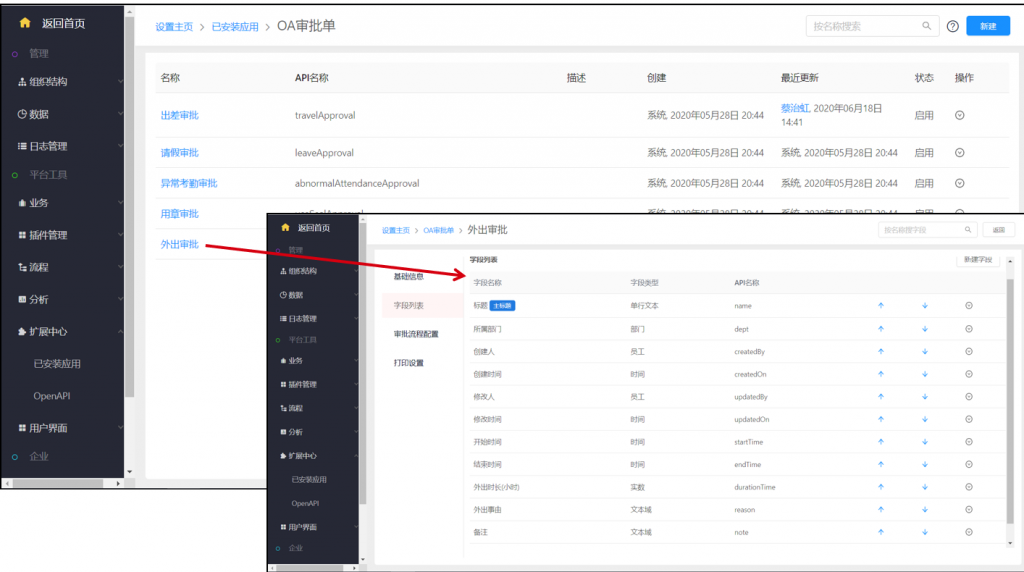 4)在OA審批單中增加“外出”審批,默認內置了開始時間、結束時間、外出時長、外出事由等字段;