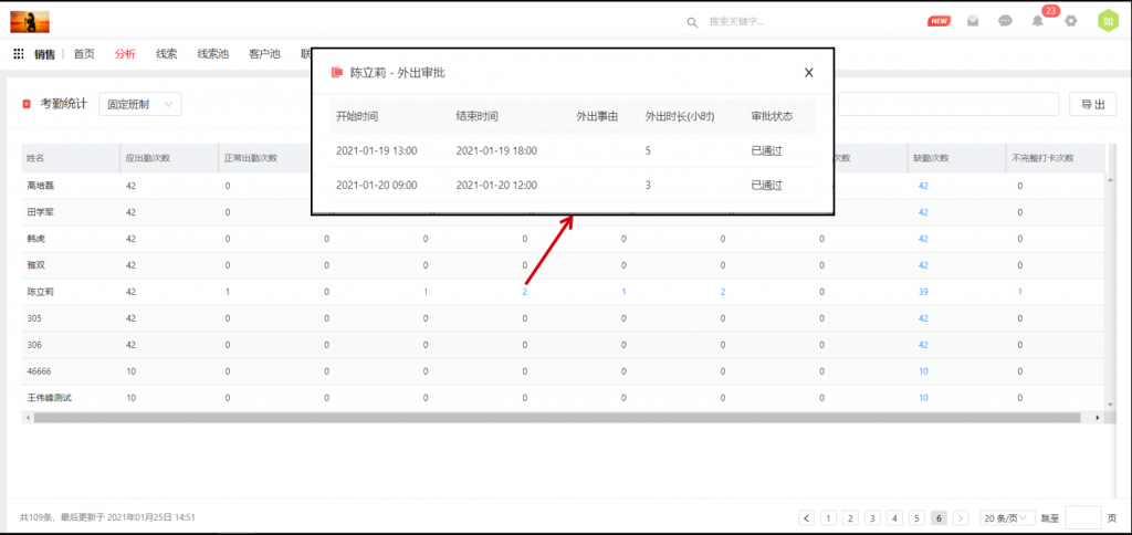 5)OA審批單中增加外出類型,外出、出差審批都可以修復異常打卡,并在考勤統計中可以穿透. 異常考勤包括:遲到、早退、缺勤。