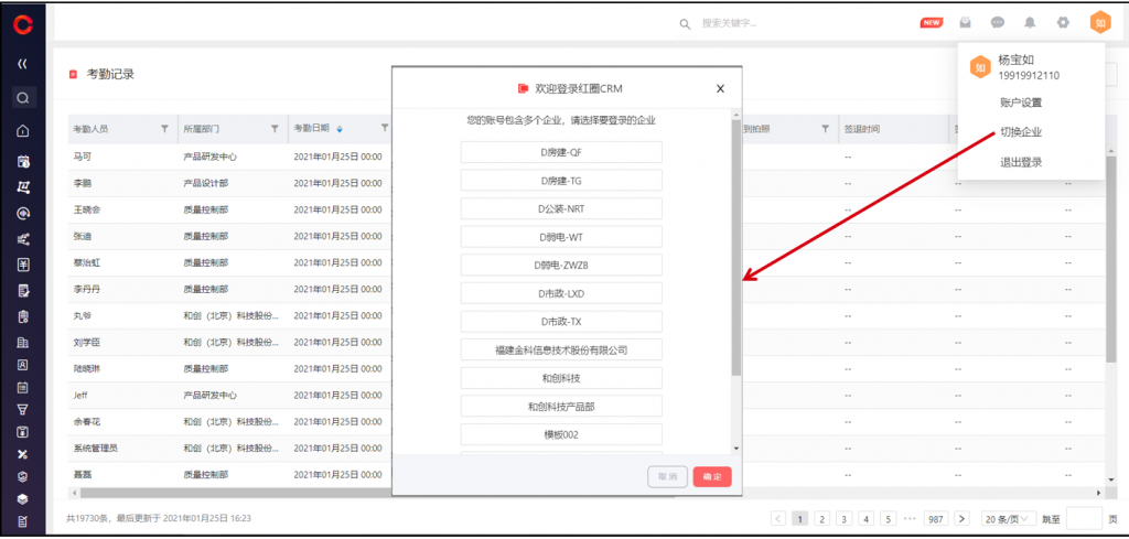 網頁端登錄系統后,支持 切換企業,無需退出登錄重新登錄