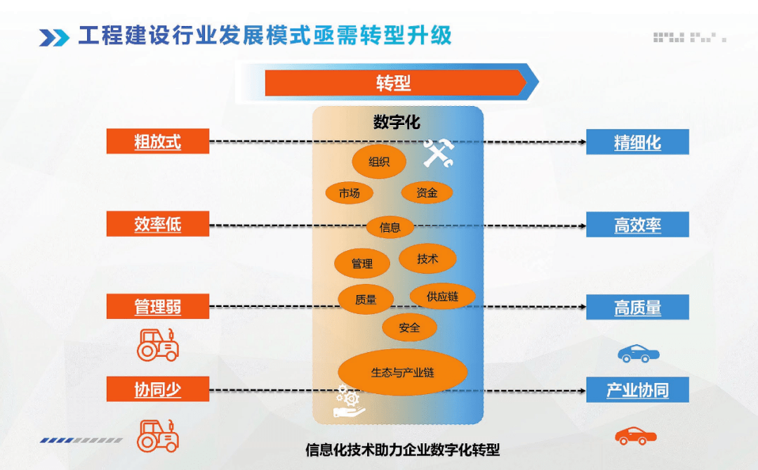 當(dāng)前行業(yè)的現(xiàn)狀是粗放式、效率低、管理弱、協(xié)同少,建筑企業(yè)的發(fā)展模式需要轉(zhuǎn)型,信息化需要隨著行業(yè)的轉(zhuǎn)型而轉(zhuǎn)型,要想高質(zhì)量發(fā)展就需要利用信息科技賦能,信息化、數(shù)字化的目的是提高精細(xì)化、高效率、高質(zhì)量、促進(jìn)產(chǎn)業(yè)協(xié)同(圖2)。