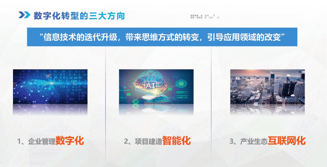 二是項目建造智能化,也就是在項目的建造過程中運用數(shù)字化技術(shù),提高人、材、機的運轉(zhuǎn)效率,縮短建設(shè)工期,降低建造成本,提高工程質(zhì)量,減少安全事故,不斷提高項目建造的智能化水平;