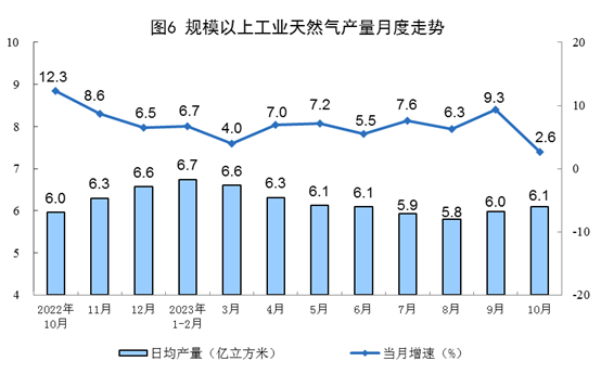天然氣生產保持平穩(wěn),進口增速加快。10月份,生產天然氣190億立方米,同比增長2.6%,增速比9月份回落6.7個百分點,日均產量6.1億立方米。進口天然氣879萬噸,同比增長15.5%,增速比9月份加快15.1個百分點。