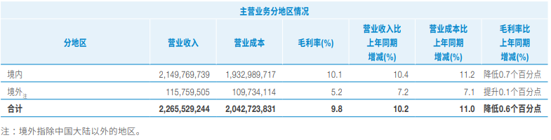 境外業務深耕經營,新簽合同額1860億元,同比增長12.3%,營業收入1158億元,同比增長7.2%。
