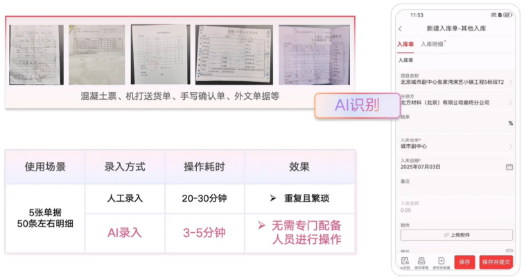 單據錄入是工程成本管控的“隱形人力黑洞”。AI錄單助手作為“智能掃描儀”,通過大模型自動識別合同、結算單、出入庫單等單據關鍵字段(如金額、工期、付款節點),實現圖像識別到系統錄入的秒級閉環。傳統流程中,成本專員需手動提取合同條款,材料員需逐條登記數千種物料信息,人力投入大且易出錯。該模塊減少90%人工操作,使成本數據歸集效率提升2.5倍,讓執行層從重復勞動轉向高價值管控。