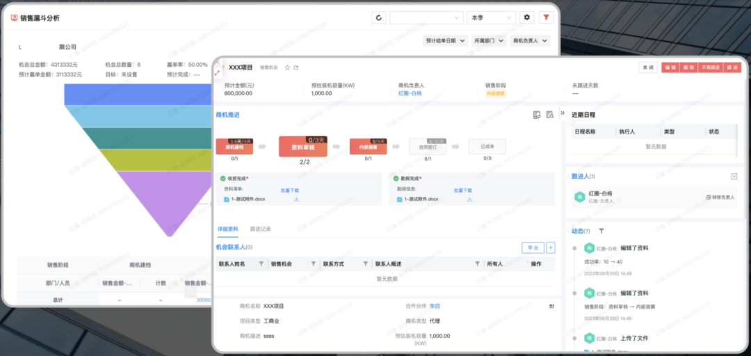 ○ 商機管理模塊(項目迷霧一掃光): 為公司構建項目商機推進轉化漏斗,清晰展示各階段項目數量及分布,幫助管理層快速鎖定需重點關注的商機,合理調配資源,加速項目轉化。