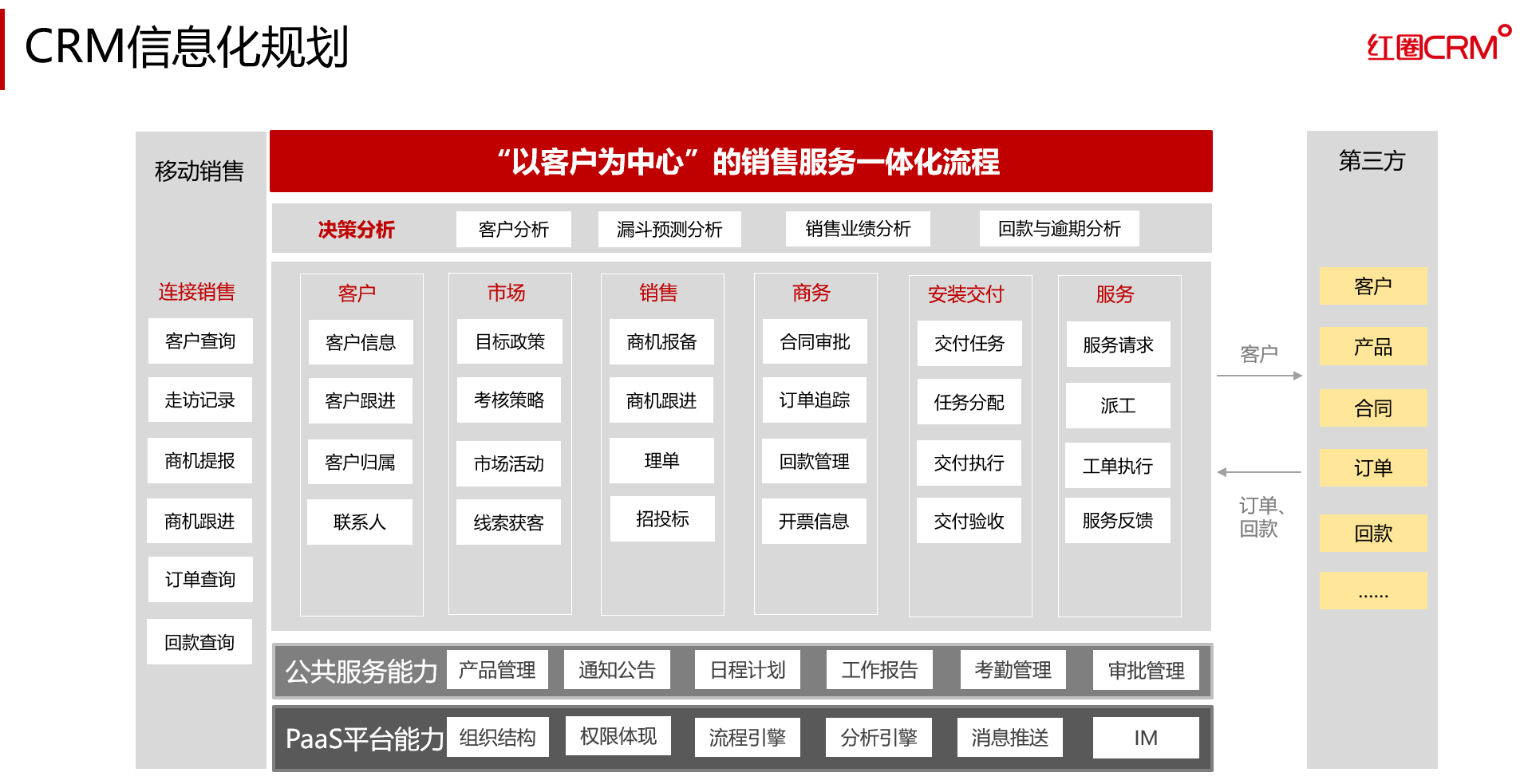 聚焦裝備制造企業,其產品多呈現為大型復雜、個性化、定制化和小批量等特點,且在產品制造、裝備制造售后服務等業務環節都可能會有產品設計與工藝方案的調整,企業的業務模式具有明顯的多元化、個性化和碎片化特征,制造業企業必然面臨商業模式和管理模式雙重挑戰。為打通與改善企業從市場營銷、銷售、研發、采購、制造到客戶服務等核心業務環節,借助紅圈CRM打造統一客戶交互平臺,提升管理質效,為客戶創造更大的價值。