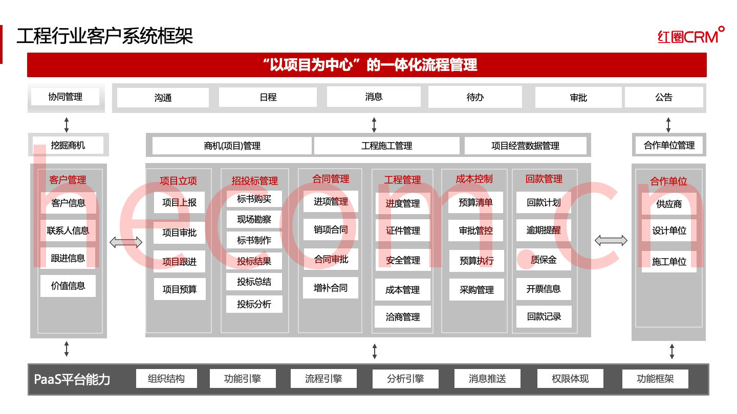 隨著市場經(jīng)濟的高速發(fā)展,企業(yè)間的競爭日趨激烈,深受政策影響的建筑工程企業(yè)也不例外,強化項目過程精細化管理,已經(jīng)成為建筑工程企業(yè)提升競爭力的重要途徑。紅圈借助互聯(lián)網(wǎng)、云計算、移動大數(shù)據(jù)等技術(shù),基于自主研發(fā)的紅圈 PaaS 平臺推出了紅圈 CRM 建筑工程項目管理系統(tǒng),幫助建筑工程企業(yè)進行業(yè)務(wù)流程梳理,打造以項目為中心的移動管理平臺,從而助力建筑工程企業(yè)在日益激烈的競爭中處于領(lǐng)先優(yōu)勢。紅圈 CRM 建筑工程項目管理系統(tǒng)適用于房建工程、市政工程、地基工程、水利工程、園林工程、環(huán)保工程、電力工程、道路工程等行業(yè)企業(yè)。